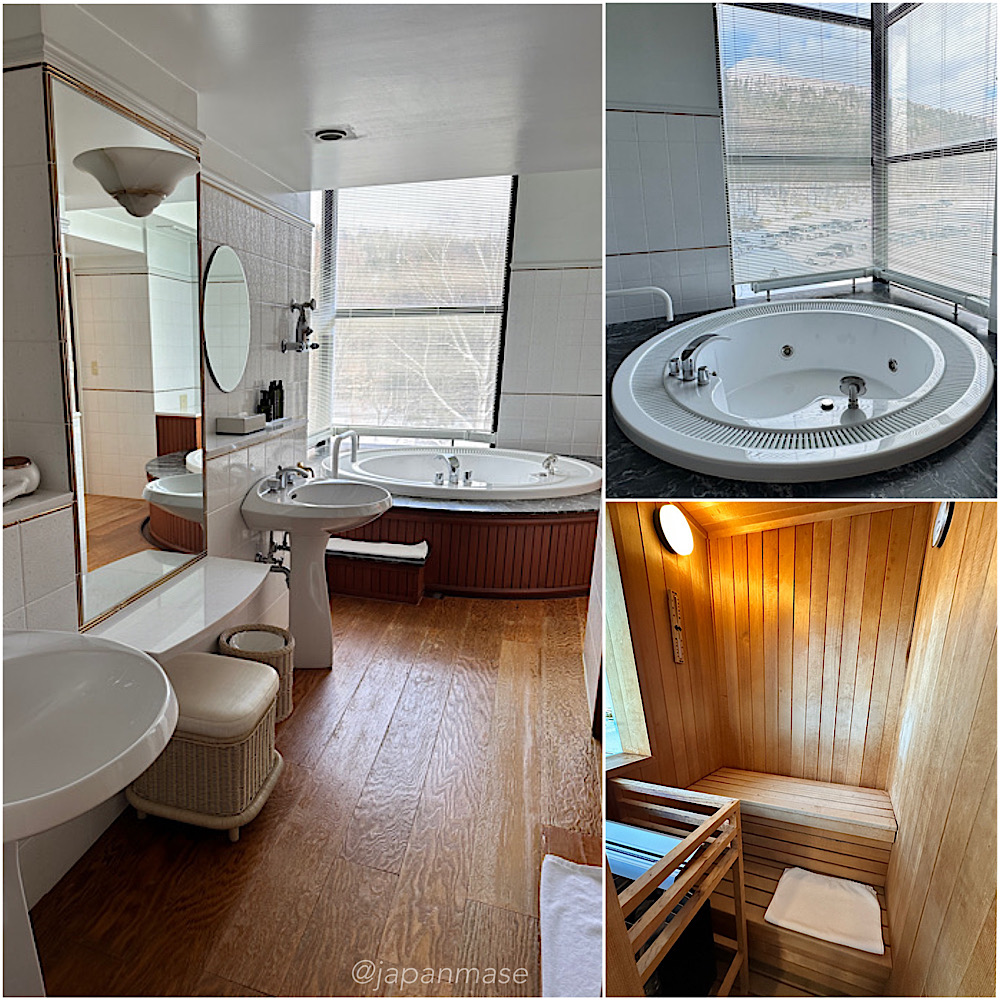 ห้องน้ำแบบญี่ปุ่น มีอ่างอาบน้ำและเก้าอี้นั่งอาบน้ำแบบออนเซ็น พักผ่อนในห้องให้ความรู้สึกผสมผสานตะวันตกและญี่ปุ่นมากๆ